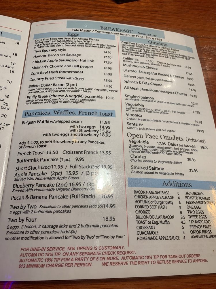 Cafe Mason offers an array of options, including vegan and vegetarian dishes, making it an inclusive choice for diverse diets. Highlights of the menu include classic pancake stacks, flavorful omelets, and crispy hash browns, all served promptly in a relaxed setting. Renowned for its friendly service, patrons rave about their satisfying experiences, whether indulging in breakfast staples or enjoying happy hour specials with beer and wine.